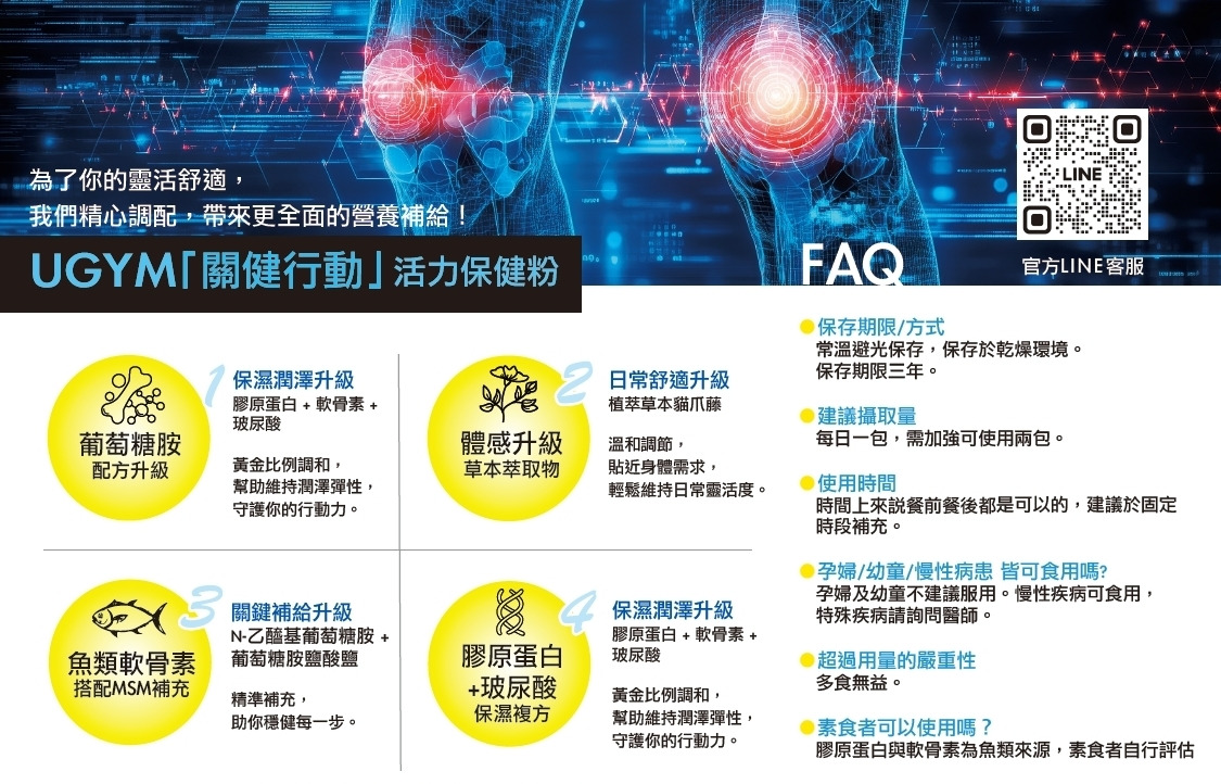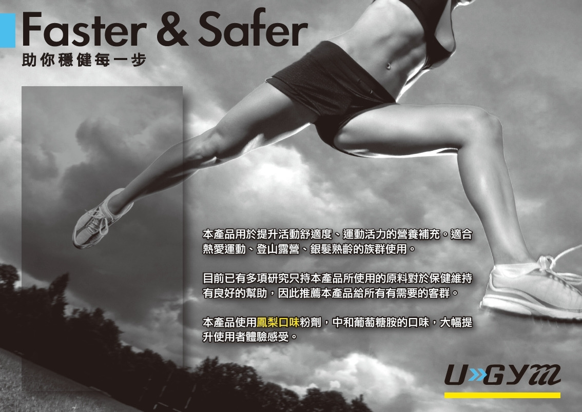 本產品用於提升活動舒適、運動活力的營養補充品,適合熱愛運動、登山、露營、銀髮熟齡族群使用。目前已有多項研究支持本產品所使用的原料,對於保健、維持有良好的幫助,因此推薦本產品給所有需要的客群。本產品使用鳳梨口味粉劑,中和葡萄糖胺的口味,大幅提升使用者體驗感受 。